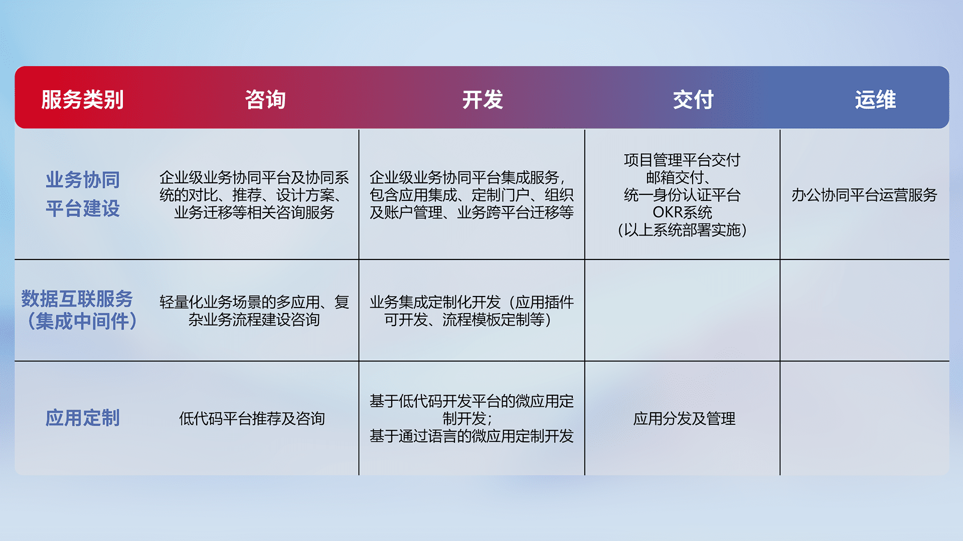 针对钉钉、、企微、、、IDaas等平台级产品提供产品的规划、、方案、、、交付、、定制化开发等服务,,,实现如统一协同办公、、智能客户服务、、、混合会议管理、、、、智能数据查询、、等业务场景,,,实现数字化转型。。。。